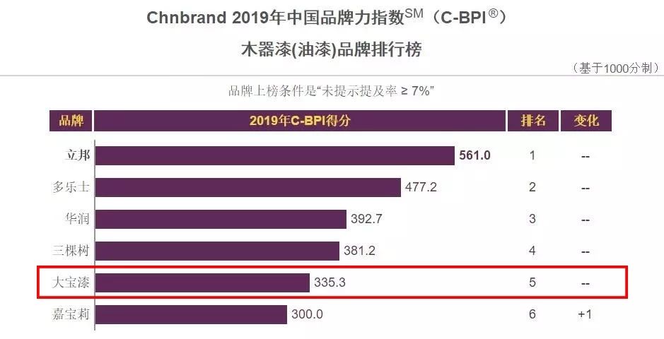 涂料经讯 4月15日,由工信部科技司和消费品司指导,中国领先的品牌评级机构Chnbrand推出的2019年中国品牌力指数发布。立邦、多乐士、大宝漆等知名涂料品牌再次上榜。其中,在墙面漆、木器漆的细分指标中,大宝漆品牌都位列前五位。
