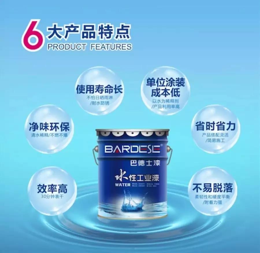 巴德士水性工业漆包括水性丙烯酸漆、水性醇酸漆、水性氨基烤漆、水性环氧漆、水性丙烯酸聚氨酯漆等,其应用效率以及单位涂装性价比明显高于同等特点的水性工业漆产品。其中水性丙烯酸漆是该项目的优选产品,该产品采用水性丙烯酸功能乳液,纳米功能材料,防锈颜料,缓蚀剂及助剂制备,应用于轻腐蚀环境中的钢结构建筑与厂房等金属表面的装饰,为武汉城市建设项目的工业防锈护航,以及对在建建筑起户外耐候、抗紫外线等重要作用。