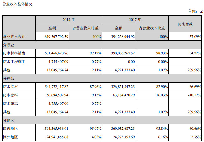 《涂料经》注意到,其中,防水卷材实现营收5.45亿元,占总营收87.96%,同比增长66.69%;防水涂料实现营收0.57亿元,占总营收9.15%,同比下降10.27%。
