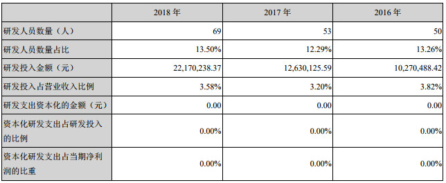 此外,2018年,凯伦股份研发投入2217.02万元,占营业收入的3.58%。研发费用较去年同期增长75.53%,凯伦股份称主要为报告期内公司研发投入增加所致。