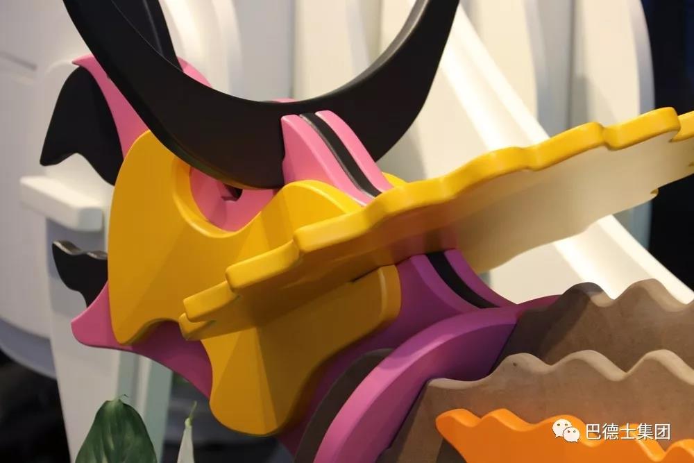 展馆现场,所有的动物摆件,均由一块一块的MDF拼接而成,每一个部件造型各异、颜色各异、大小不一,且有部分区域采用原木色和上色对比效果。这展现了巴德士木器粉末涂料在木器上的成熟应用,已经可以实现涂装各种造型的木器,实现丰富的表面色彩效果,实现粉末透明效果、粉末底+水性面的工艺搭配和平面粉效果等。