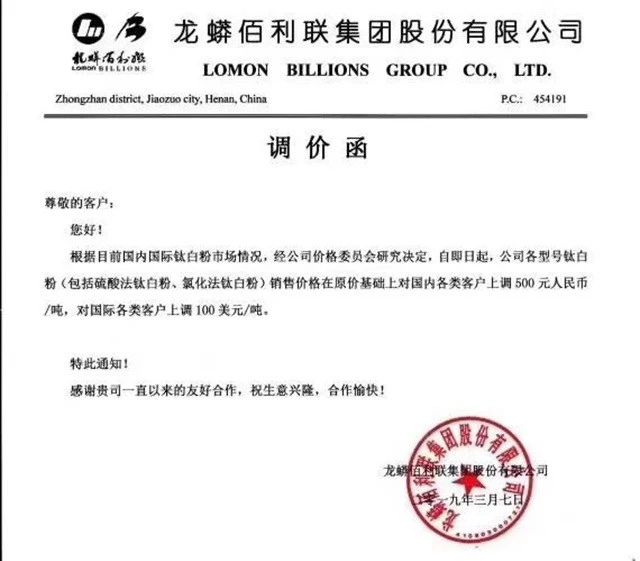 3月7日,龙蟒佰利再次宣布,自即日起公司各型号钛白粉(包括硫酸法钛白粉、氯化法钛白粉)销售价格在原价基础上对国内各类客户上调500人民币/吨,对国际各类客户上调100美元/吨。