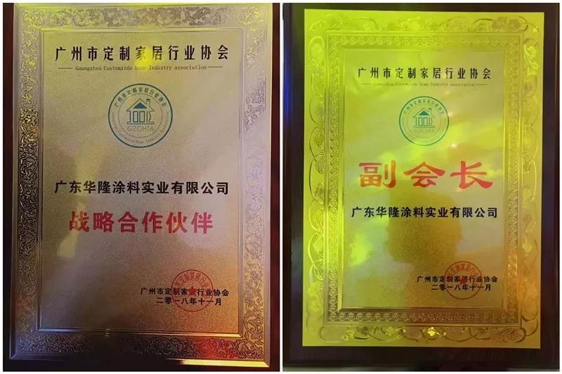 在国家及省市级行业领导嘉宾见证下,在欧派、索菲亚、尚品宅配、好莱客、TATA、现代筑美家居、润成创展等中国全屋定制家居行业大咖的见证下,华隆涂料凭借优异的产品品质当选为广州市定制家居行业协会首届副会长单位。