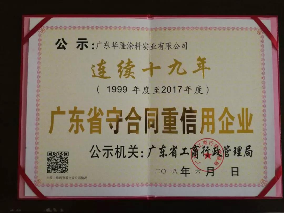 华隆涂料凭借秉承诚信经营的理念,推进企业诚信体系建设,营造企业内部良好的信用环境,再次被评为“2017广东省守合同重信用企业”,这是华隆涂料连续十九年荣获此荣誉称号。