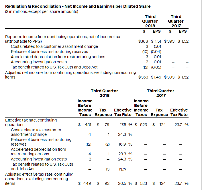 2018年第三季度PPG持续经营业务的净收入为3.68亿美元,或每股摊薄收益1.51美元。调整后的持续经营净收入为3.53亿美元,或每股摊薄收益1.45美元。本季度报告和调整后的有效税率分别约为17.5%和20.5%。数据显示,PPG 2017年第三季度报告和调整后的持续经营净收入为3.93亿美元,或每股摊薄收益1.52美元。本季度报告和调整后的有效税率约为24%。