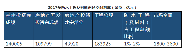 首先,根据经验数据可以大致测算防水行业空间,一般而言防水工程(及材料)占工程总额的1-2%,根据2017年纪检投资+房地产投资建安部分测算出防水工程及材料市场空间约1800-3600亿元。