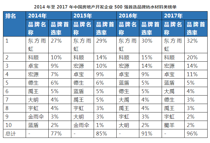 大企业的优势持续显现,涂料经记者注意到在2014-2017年中国房地产开发企业500强首选品牌防水材料类,东方雨虹、科顺、卓宝、宏源等品牌首选率均呈逐年上升趋势。