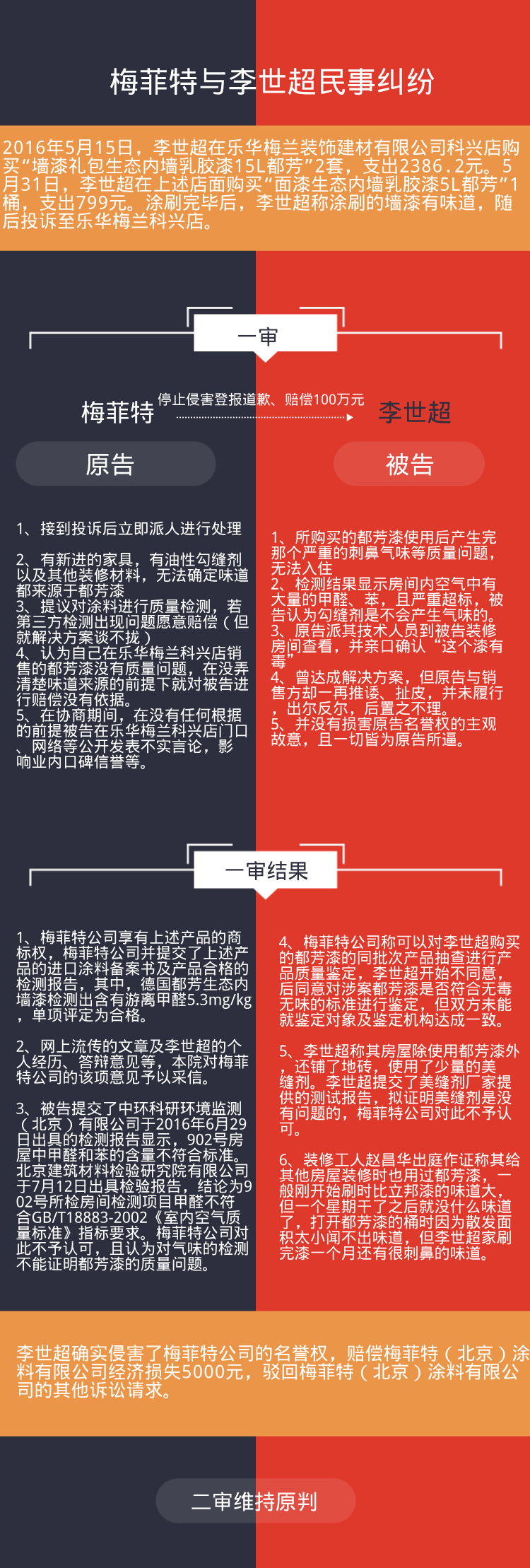 2018年9月3日,业内涂料媒体爆出历时两年多的“李世超和梅菲特(北京)涂料有限公司民事纠纷”一案一审、二审分别与2018年5月25日以及2018年7月26日分别完成审理。判定消费者李世超的行为侵犯了梅菲特公司的名誉权,其应停止侵害,并登报赔礼道歉,同时赔偿5000元经济损失。