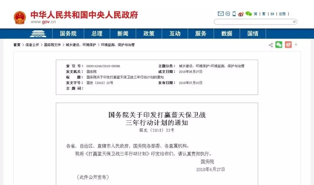 图为《国务院关于印发打赢蓝天保卫战三年行动计划的通知》