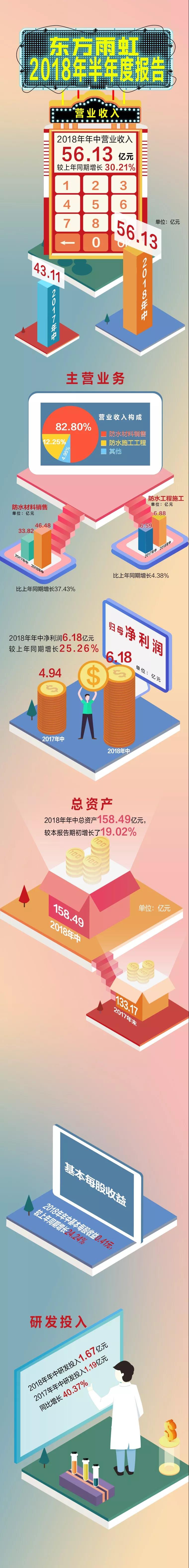 涂料经讯 8月28日,东方雨虹(002271)公布2018年半年报。报告期内,公司实现营业收入56.13亿元,同比增长30.21%;归属于上市公司股东的净利润6.18亿元,同比增长25.26%;基本每股收益0.41元。