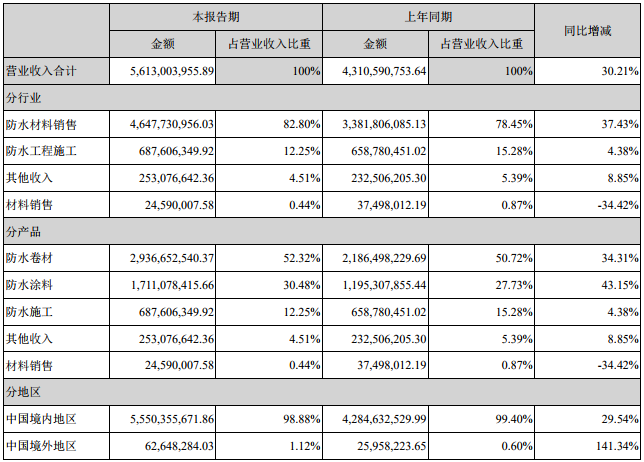 根据财报,公司主营防水材料销售、防水工程施工以及其他,分别占营业收入比重为82.80%、12.25%、4.95%。公司主要产品包括防水卷材、防水涂料等,其中,防水卷材营收29.37亿元,同比增长34.31%;防水涂料营收17.11亿元,同比增长43.15%。