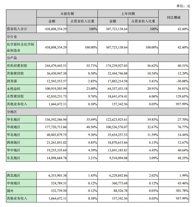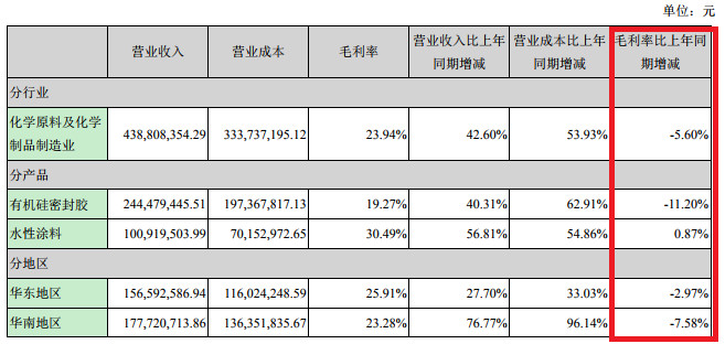 成本的增加必然影响到毛利率下降。根据公告显示,集泰化工主营产品有机硅密封胶、水性涂料营业成本同比上升50%以上,毛利率分别同比增减-11.20%、0.87%。在地区方面,华东地区营业成本同比上升33.03%,毛利率同比下降2.97%;华南地区营业成本同比上升竟高达96.14%, 毛利率同比下降了7.58%。
