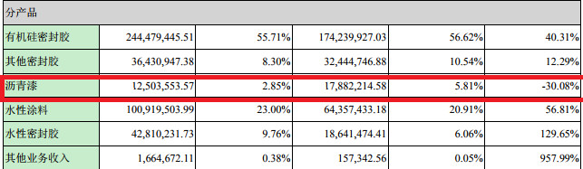 沥青漆特指溶剂型沥青漆,系集泰化工为集装箱制造市场研制的产品,占公司营业务收入的2.85%。报告称,受环保趋严、集装箱市场全面“油改水”政策的影响,沥青漆的销售收入持续下滑。报告期内,集泰化工沥青漆板块的销售收入较上年同期下降30.08%。