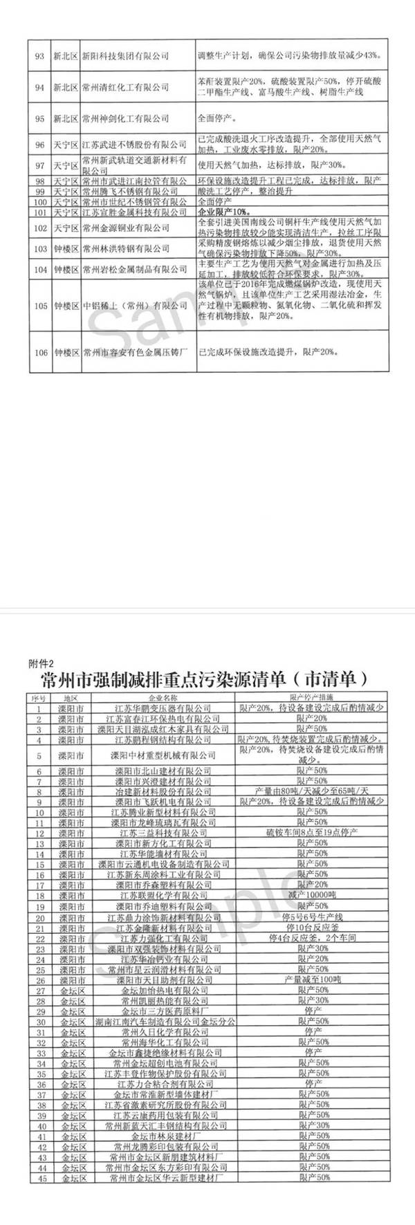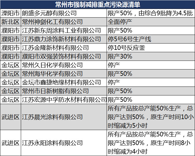 以及金坛市鑫捷绝缘材料有限公司(停产)、常州市日新树脂有限公司(限产50%)、江苏宏源中孚防水材料有限公司(限产50%)、江苏晨光涂料有限公司(所有产品按总产能50%生产,总限产达到50%,原生产时间10小时缩减为5小时)、江苏永阳涂料有限公司(所有产品按总产能50%生产,总限产达到50%,原生产时间8小时缩减为4小时)。
