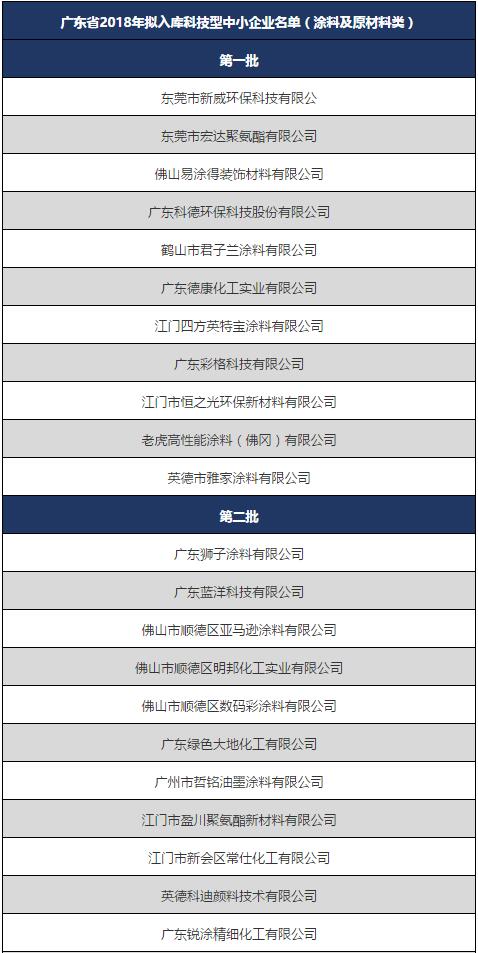 涂料经讯 《涂料经》从广东省科学技术厅了解到,2018年5月15之后分别公布了“广东省2018年第五/六/七/八批拟入库科技型中小企业名单”,其中涂料企业共有29家涂料企业。分别是合众(佛山)化工有限公司、惠州市天宏涂料有限公司、中山市荣业化工原料有限公司、中山市伯士的化工科技有限公司等。具体情况如下: