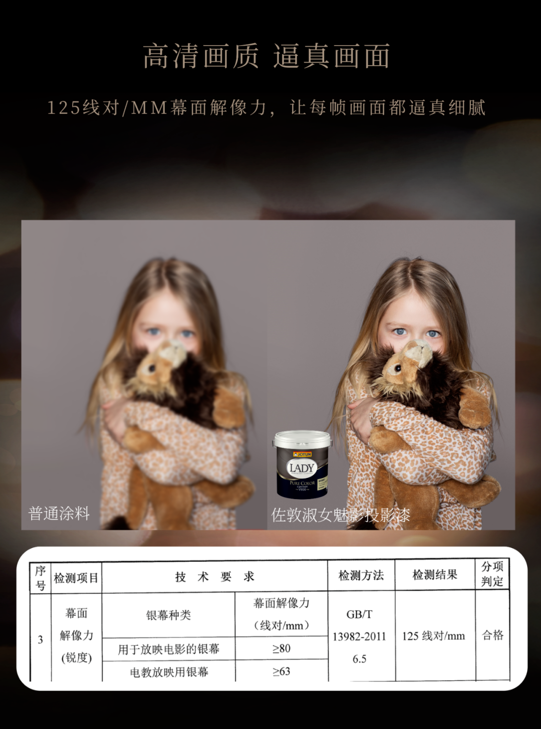 125线对/MM幕面解像力,让每帧画面都高清细腻;投影亮度可以达到D型屏幕要求,高亮度增益,让画面更清晰;再加上优异的色彩对比度,让画面鲜亮明丽,带来超凡色彩体验,还原每一帧影像的真实色彩,打造极致的观影效果。