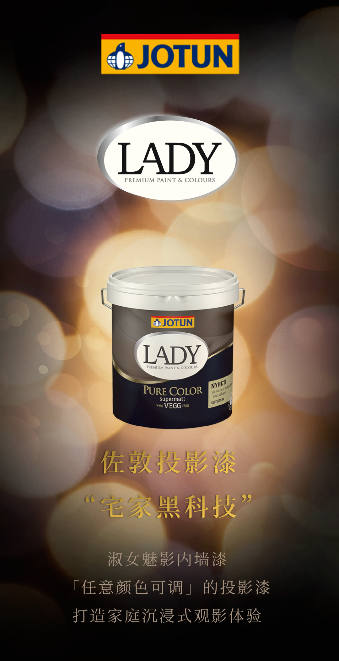 佐敦涂料就与时俱进,专注搞“黑科技”,推出了完美搭档投影仪的产品——佐敦黑科技投影漆。既解决了幕布的问题,又满足了大部分消费者对于缤纷色彩的需求。这款产品叫淑女魅影内墙漆,是一款任意颜色可调的投影漆,告别白墙时代,打造家庭沉浸式观影体验。