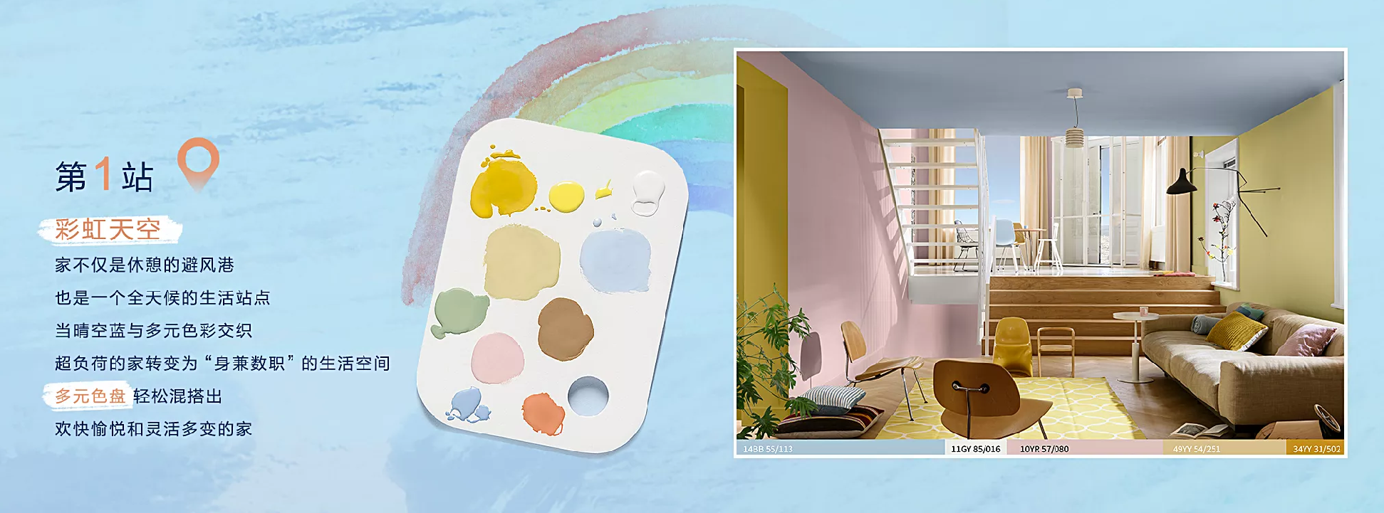 天空与彩虹相得益彰,使用多元色盘便可轻松混搭出“彩虹天空”的装修风格,呈现欢快愉悦和灵活多变的家,是内心想象力丰富、向往多彩生活的“小可爱”们的首选。