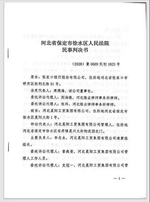 2020年12月31日,根据河北晨阳管理人的通知,徐水法院裁定中止由张家口银行提出的债权人撤销权纠纷案件的审理。2021年1月20日,因河北晨阳管理人可以参加诉讼,遂恢复审理,并于2021年2月1日公开开庭进行了审理(未审结)。