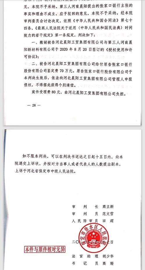 2021年8月19日,徐水法院再次开庭审理了由张家口银行提出的债权人撤销权纠纷案件,并做出判决:撤销河北晨阳与河南晨阳于2020年8月20日签订的《授权使用和许可协议》。