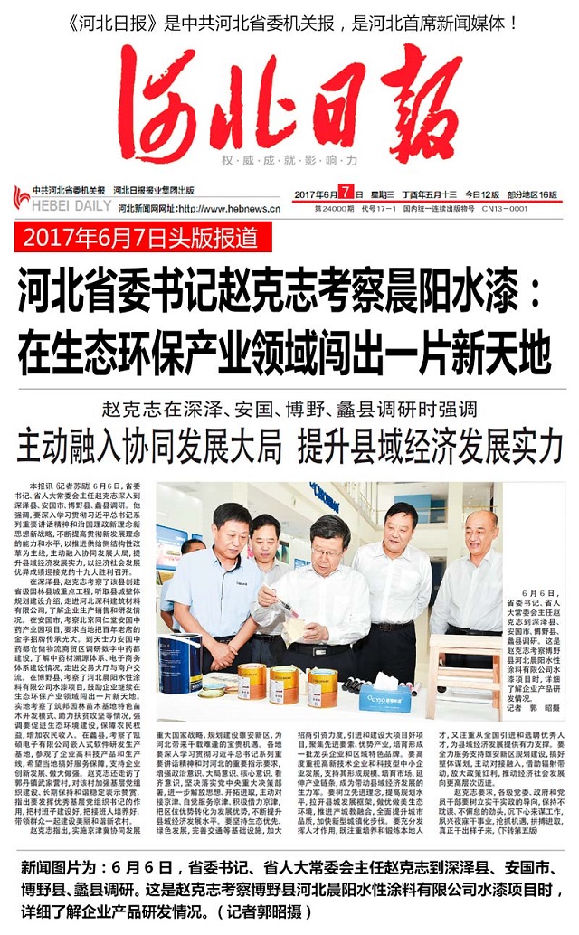 6月6日,河北省委书记、省人大常委会主任赵克志到深泽县、安国市、博野县、蠡县调研。其中,在博野县,他考察了河北晨阳水性涂料有限公司水漆项目时,鼓励企业继续在生态环保产业领域闯出一片新天地。赵克志指出,实施京津冀协同发展重大国家战略,规划建设雄安新区,为河北带来千载难逢的宝贵机遇,要主动融入协同发展大局,提升县域经济发展实力。